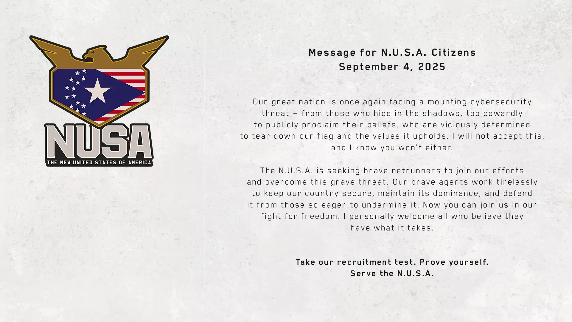 На официальных каналах Cyberpunk 2077 появилось сообщение от имени президента Новых Соединённых Штатов Америки (N.U.S.A.) Розалинд Майерс. В обращении говорится о нарастающей угрозе в киберпространстве и призыве «смелых нетраннеров» на службу. Финальный посыл: «Пройди тест. Докажи, что достоин. Служи N.U.S.A.»