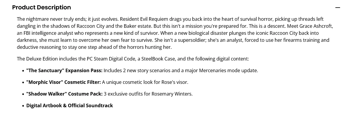 GameStop опубликовал страницу коллекционного издания PC-версии Resident Evil Requiem, и в описании предлагаемых бонусов фигурируют косметические предметы для Розмари Уинтерс — дочери Итана Уинтерса из Resident Evil 7 и Resident Evil 8.