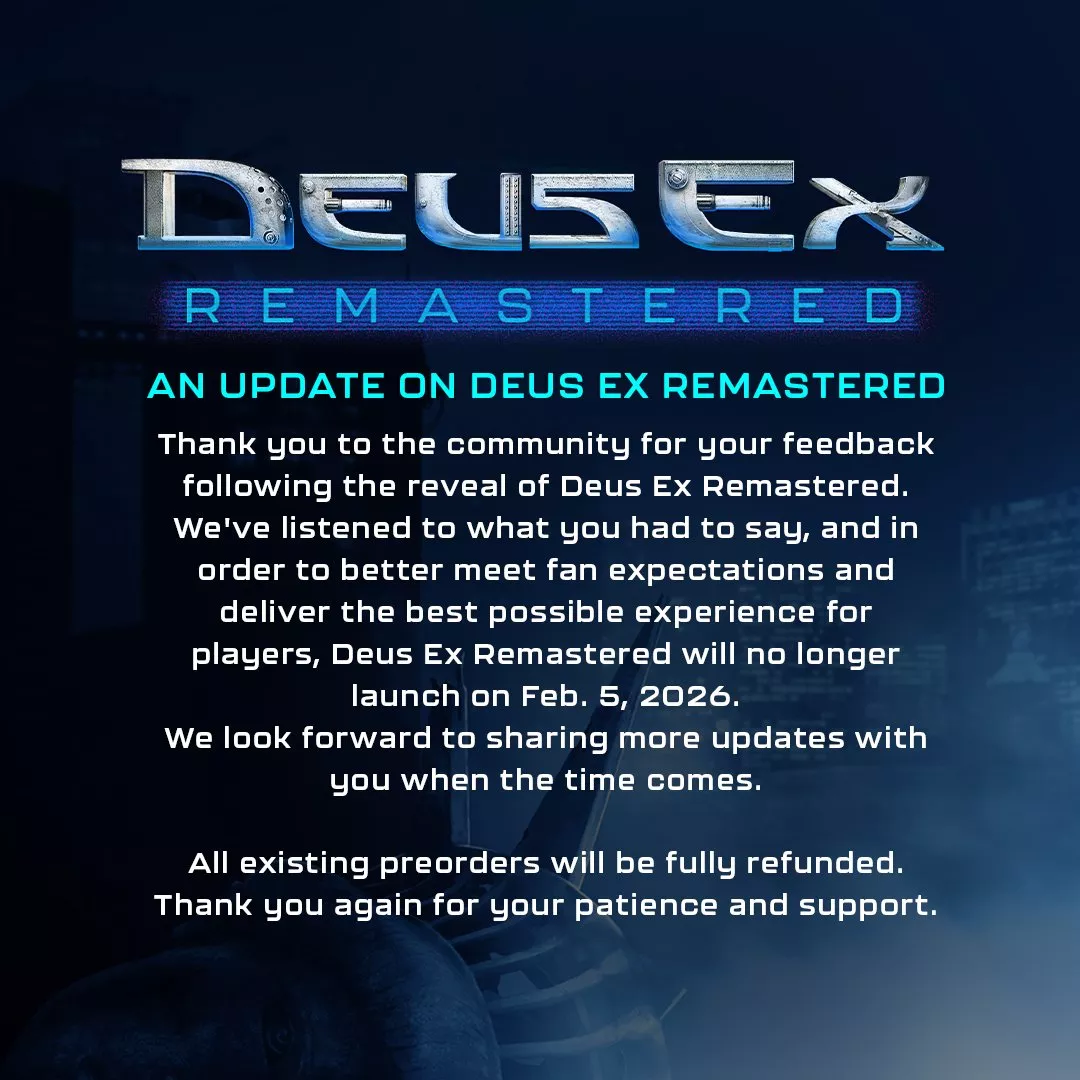 Aspyr объявила, что Deus Ex Remastered больше не выйдет 5 февраля 2026 года. Переработанная версия отправлена на доработку без новой даты релиза. Разработчики поблагодарили игроков за обратную связь после анонса и подчеркнули: решения принято ради улучшения качества и соответствия ожиданиям фанатов.
