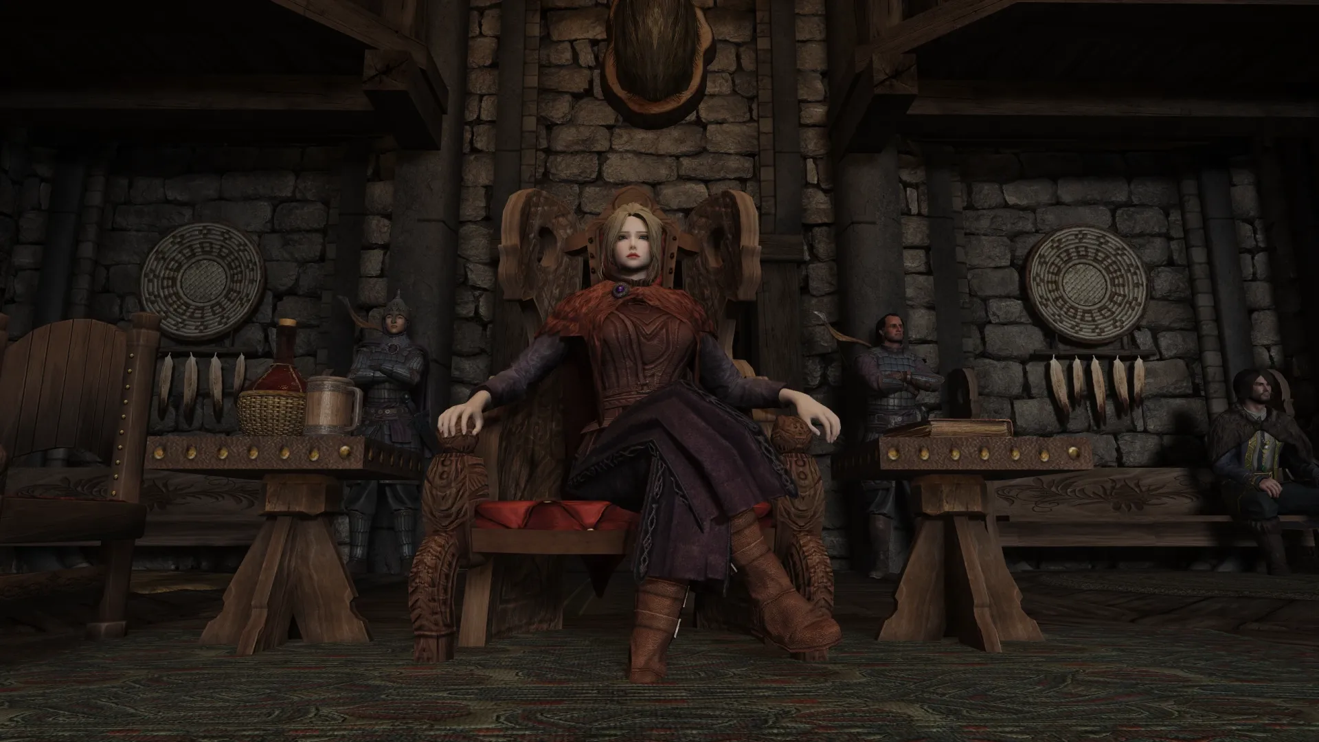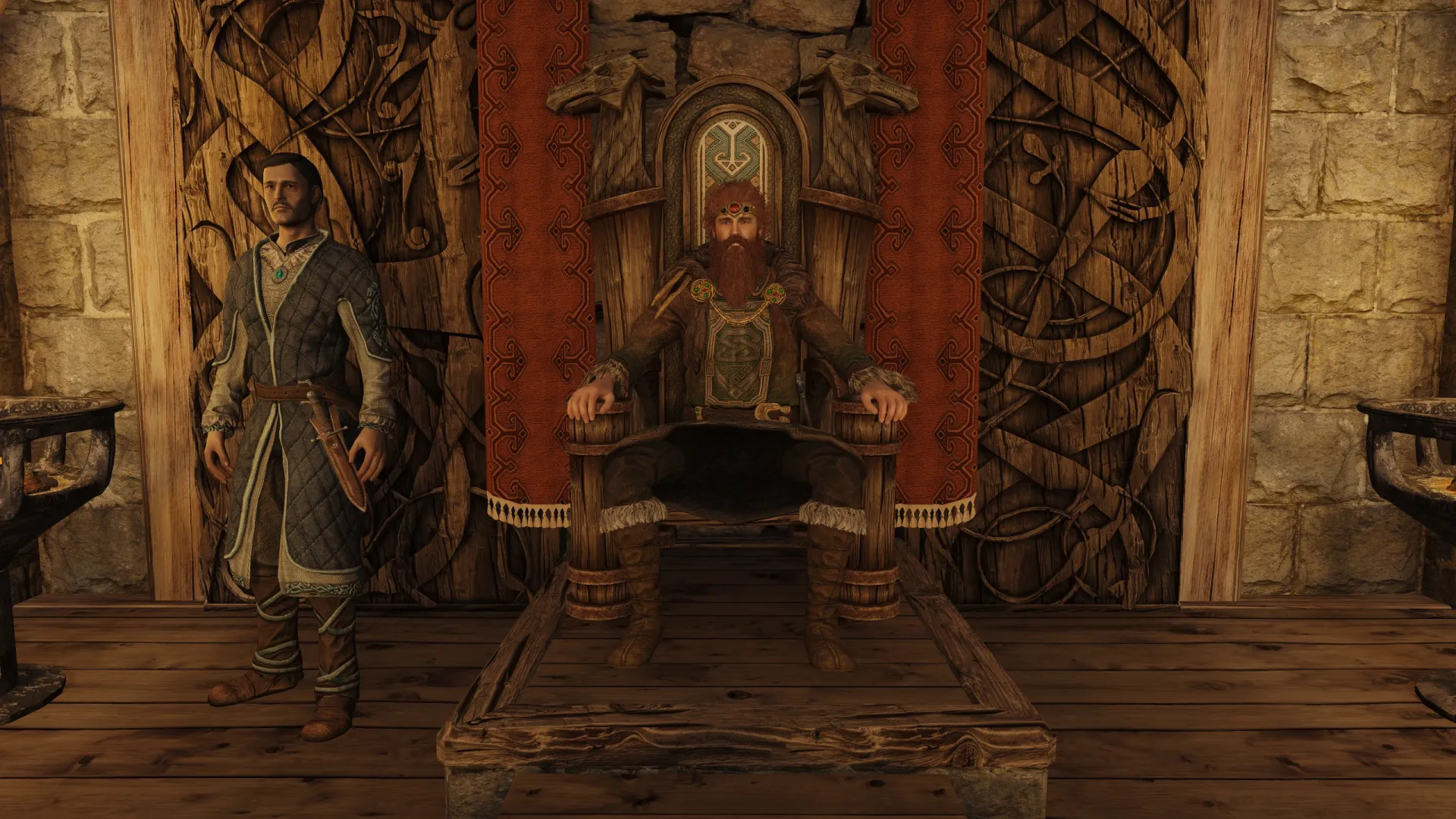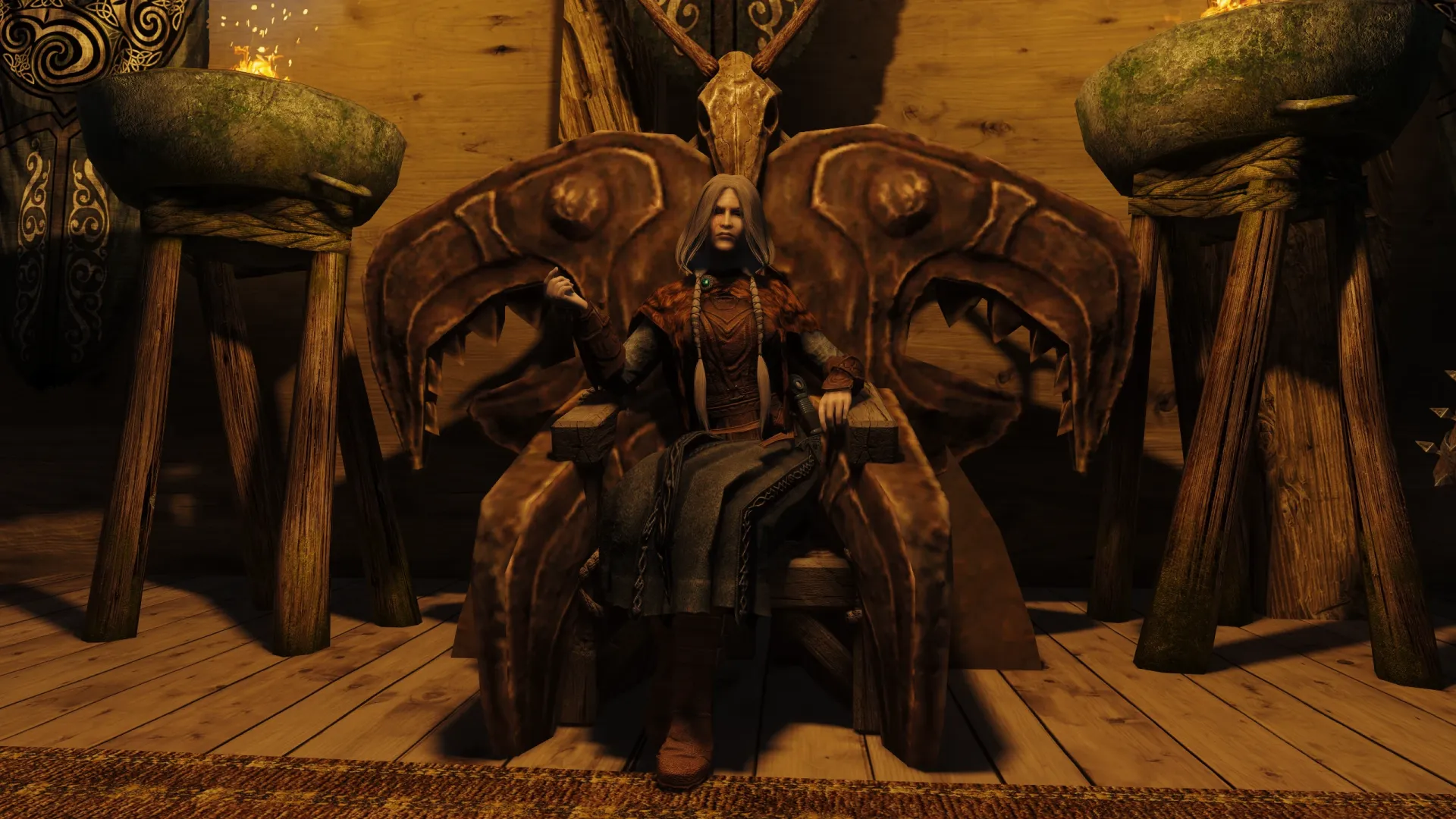 Теперь каждый ярл сидит на троне по-своему — анимации отражают характер персонажа, его статус и тип трона. Исключением стал Кральдар, возможный ярл Винтерхолда: для него оставили оригинальную анимацию, поскольку она лучше соответствует образу персонажа.