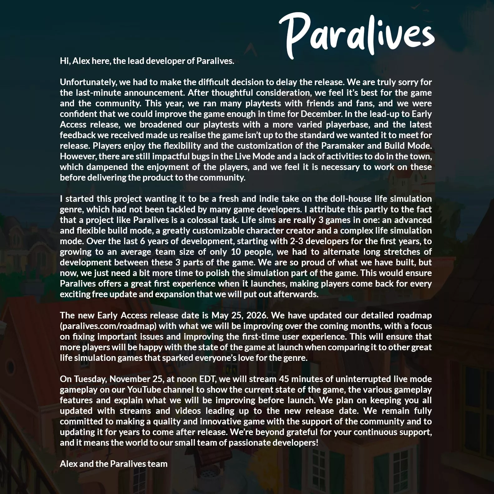 Авторы симулятора жизни Paralives сообщили о переносе запуска раннего доступа. Игра должна была выйти в декабре 2025 года, но тесты показали ряд серьёзных проблем, мешающих релизу. В итоге команда решила дать себе ещё несколько месяцев на полировку.