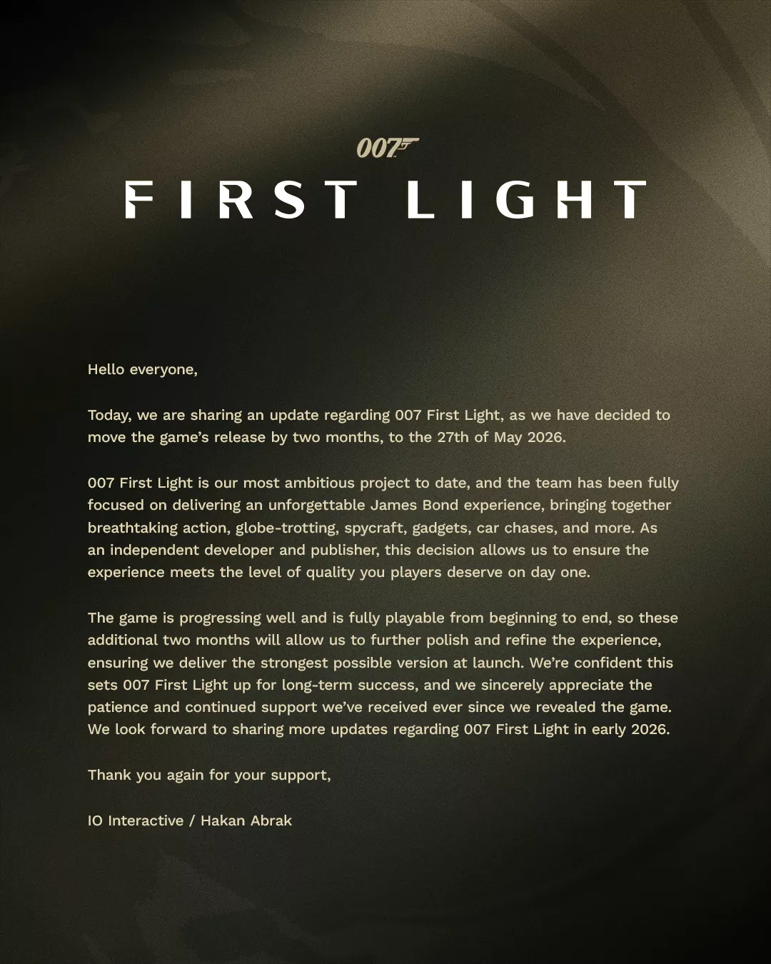 Студия IO Interactive объявила о переносе релиза 007 First Light. Игра выйдет не раньше запланированного срока, а 27 мая 2026 года — на два месяца позже прежнего окна. Об этом сообщил глава студии Хакан Абрак в открытом обращении к игрокам.