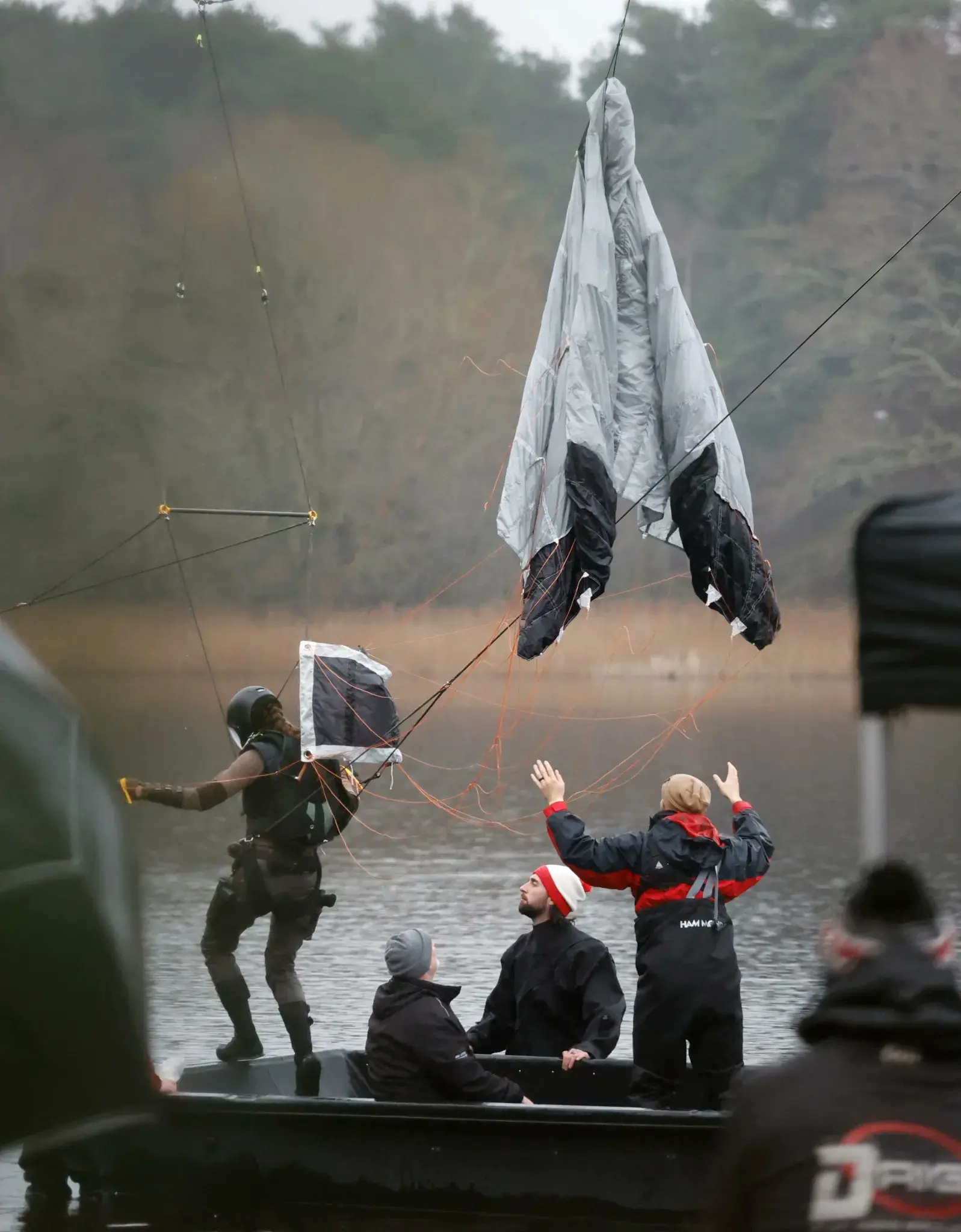 Софи Тёрнер, несмотря на дождь, парит над озером, самостоятельно выполняя трюки с парашутом.