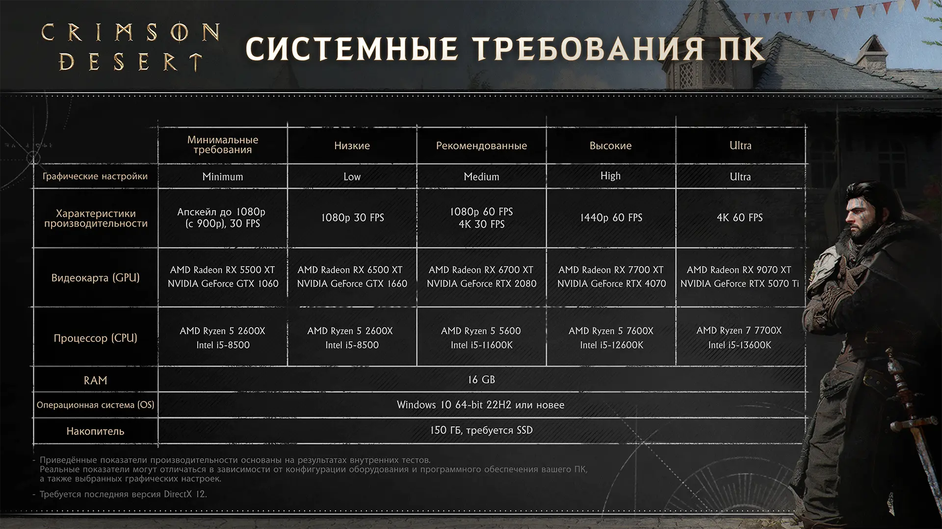 Студия Pearl Abyss опубликовала финальные системные требования PC-версии Crimson Desert, а также указала конфигурации для разных разрешений и уровней графики — от 1080p до нативного 4K при 60 FPS.