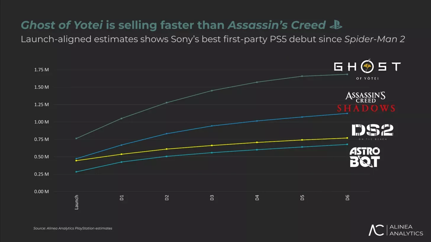 По данным аналитика Риса Эллиота (Alinea Analytics), Ghost of Yōtei продалась более чем 1,6 миллионами копий с момента релиза, а если учитывать розничные поставки — свыше 2 миллионов.